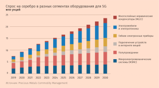 А вот область, которую ждет взрывной рост спроса на серебро, – оборудование и устройства для связи пятого поколения (5G). Аналитики BMO еще в марте указывали, что стремительное развертывание сетей 5G в Китае (тогда было объявлено, что к концу года в 18 провинциях планируется построить более 413 000 базовых станций) положительно отразится на рынке серебра. Серебро будет «необходимым компонентом практически для всех аспектов этой технологии», говорится в докладе Precious Metals Commodity Management для The Silver Institute. По данным ее экспертов, в 2019 г. мировой спрос на серебро, связанный с только начавшей разворачиваться технологией 5G, составил 7,5 млн унций, но к 2025 г. он вырастет до 16 млн, а к 2030 г. – до 23 млн. Серебро будет необходимо и для интернета вещей, который невозможен без 5G. Эти сферы ждет ускоренное развитие после пандемии, уверены аналитики Morgan Stanley: гораздо больше людей будет работать из дома (и им нужны быстрые каналы связи, способные передавать большие объемы информации), а компании активнее займутся трансформацией бизнеса, включая автоматизацию производства и интернет вещей, будут развиваться умные города, автономный и электрический транспорт.