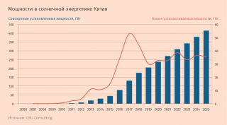 Мировым лидером по установленным и вводимым в эксплуатацию мощностям на рынке фотогальванических элементов останется Китай, прогнозирует CRU Consulting: установленные мощности в солнечной энергетике вырастут там с 250 ГВт в 2019 г. до 414 ГВт в 2025 г.