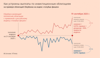 Главное – отдавать себе отчет в том, что привлекательный доход по таким облигациям возможен только при хорошем стечении обстоятельств, а при неудачном можно лишь остаться при своих. Например, Сбербанк сейчас размещает пятилетние облигации с привязкой к индексу голубых фишек Московской биржи. Фиксированный купон по ним – 0,01% годовых, а дополнительный доход зависит от значения индекса на 19 сентября 2025 г. Если к этой дате индекс будет больше, чем в начале торгов облигациями 21 сентября 2020 г., инвестору положено 90% роста индекса.