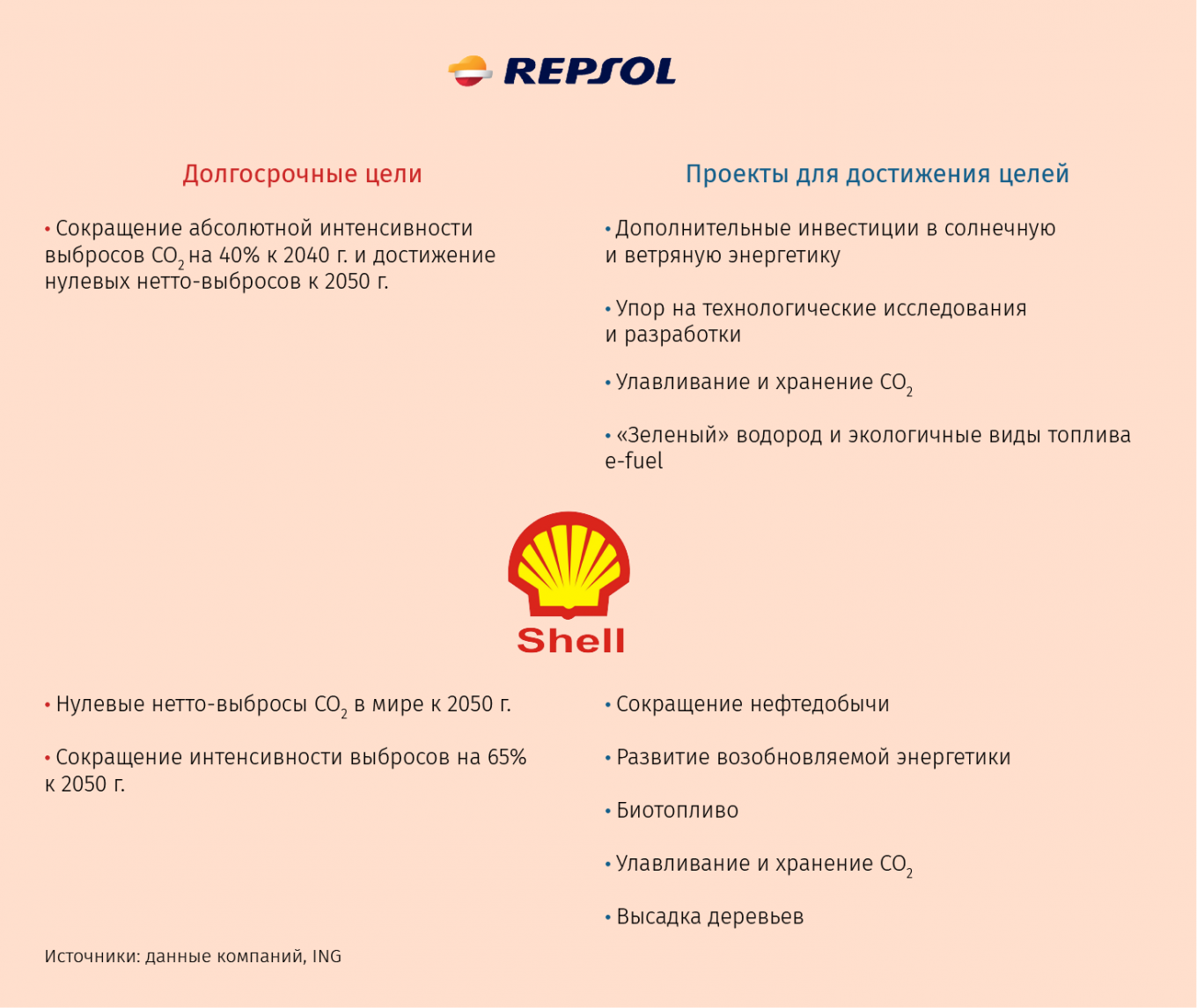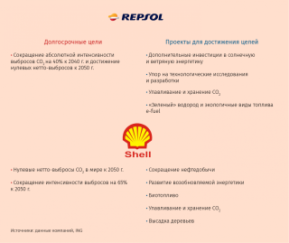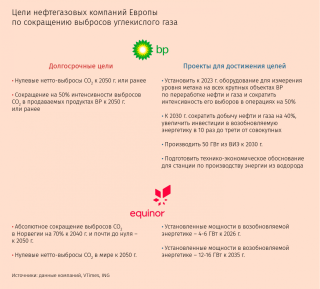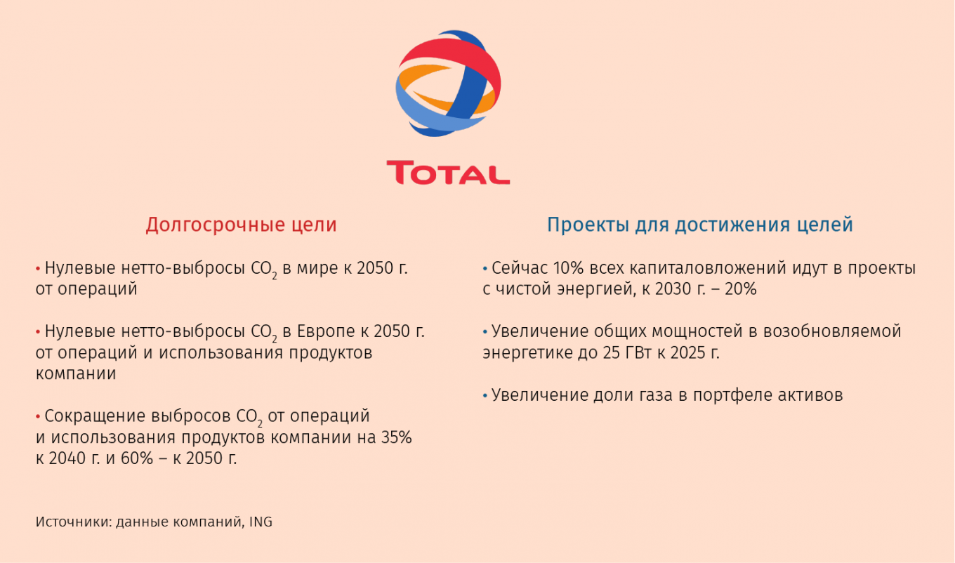 Объявленные перемены затрагивают всю цепочку создания стоимости, отмечают аналитики ING. Они включают собственные действия компаний (от ограничения выбросов метана при испытании скважин и сжигании попутного газа до мер, компенсирующих вредные выбросы, таких как хранение углекислого газа, производство биопродукции и посадка деревьев) и операции других участников (улавливание выбросов на газовых электростанциях, производство более экологичного транспорта и т. д.). Ряд компаний, включая Total, Shell, Repsol, Eni, выходят в такие секторы, как производство электричества, дистрибуция его и газа, станции подзарядки и проч.