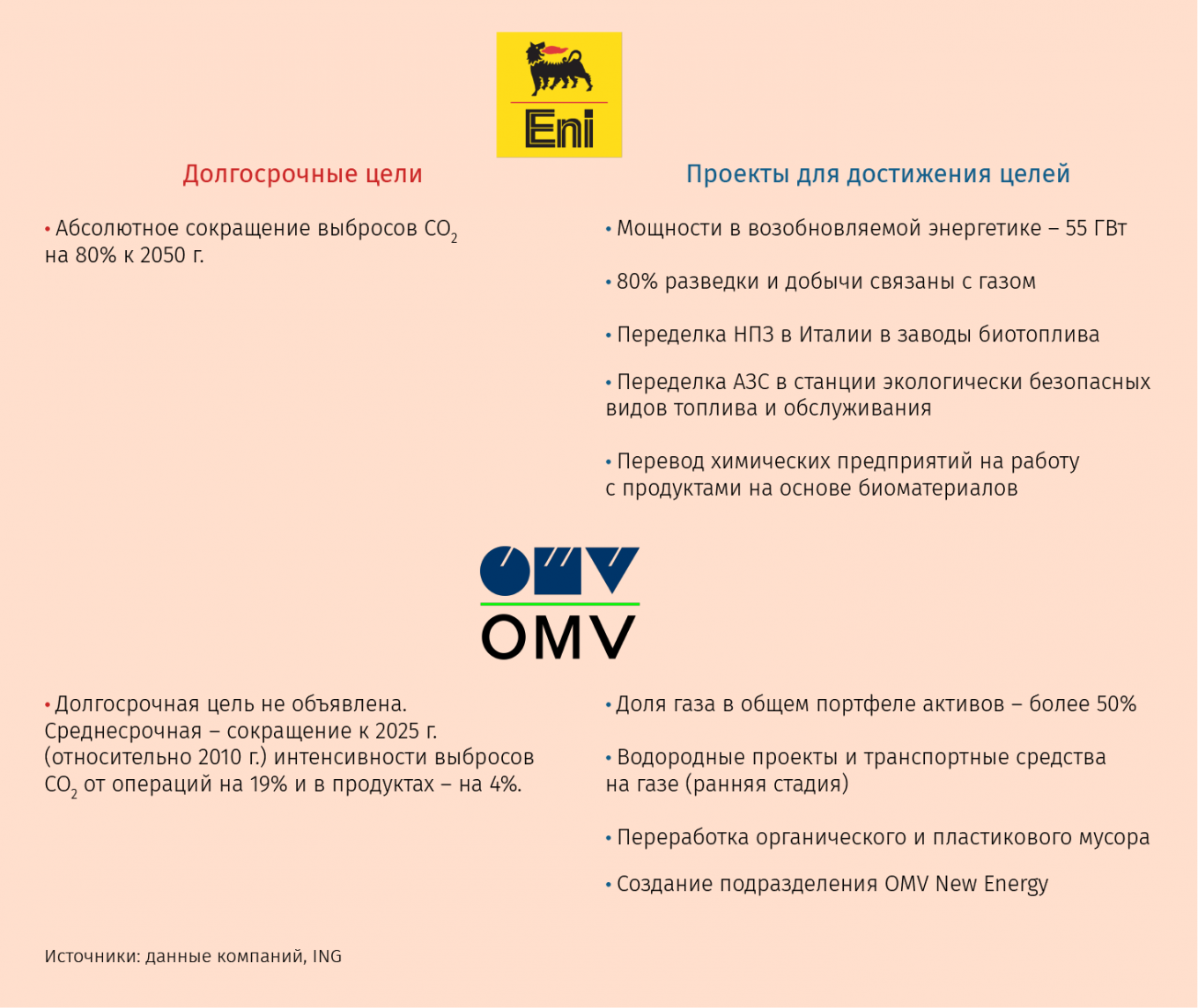 Первой о стратегической цели стать компанией с нулевыми нетто-выбросами объявила в декабре 2019 г. испанская Repsol. Один из самых детальных планов по «зеленому переходу» представила итальянская Eni. К середине века ее разведка и добыча будут на 80% связаны с газом; мощности возобновляемых источников энергии (ВИЭ) достигнут 55 ГВт, потреблять электричество из них будут 20 млн человек; будут реализованы проекты по улавливанию и хранению углекислого газа более чем на 40 млн т в год и проч.