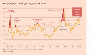 Мы вскоре сможем понять, надувается ли настоящий пузырь или рынок скорректируется до более «здоровых» уровней, считают аналитики Stifel. Они используют коэффициент CAPE, разработанный нобелевским лауреатом Робертом Шиллером для оценки обоснованности стоимости компаний в долгосрочной перспективе. Это отношение капитализации к средней прибыли за последние 10 лет (с поправкой на инфляцию). «CAPE вскоре скажет нам, начнет ли P/E достигать «пузырных» значений, как в конце 1920-х и 1990-х гг.», когда капитализация превышала долгосрочную прибыль более чем в 30 раз, или мы уже наблюдаем пик, как в середине 1930-х и 1960-х гг., отмечают они. В первом случае, считают в Stifel, S&P 500 заметно превысит 3700 пунктов (сейчас – 3400, на пике в начале сентября – немногим менее 3600).