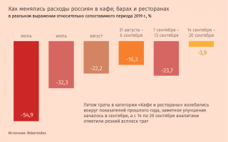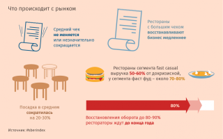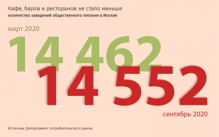 В конце апреля, когда в Москве действовали жесткие ограничения, связанные с пандемией COVID-19, и заведения общепита были закрыты, президент Федерации рестораторов и отельеров (ФРиО) Игорь Бухаров заявил, что без адекватной помощи государства с рынка могут уйти 70% заведений. По данным Департамента потребительского рынка Москвы, после окончания периода изоляции в июне возобновили деятельность 12 306 заведений – это 84,6% от их числа в марте 2020 г. (14 462). На начало сентября 2020 г. в Москве работали 14 552 заведения общественного питания.