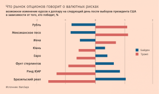 Инвесторы также приобретают опционы, чтобы защититься от геополитических рисков, которыми могут грозить те или иные результаты выборов. Валютные опционы свидетельствуют, по данным банка Barclays, что рубль и бразильский реал могут оказаться одними из самых волатильных валют в день после выборов. По словам трейдеров, операции с опционами на рубль в последнее время выросли, хотя обычно российская валюта не вызывает такого интереса в связи с выборами президента США, как другие, пишет WSJ. Но теперь участники рынка предполагают, что риски санкций против России вырастут, если победит Байден (см. график).