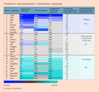 В рейтинге лидируют «разрушители традиций», такие как Tesla, BYD, BAIC и Geely, но Volkswagen, Daimler, Renault и Hyundai уже способны бросить им вызов; у всех этих компаний коэффициент устойчивой стоимости более 1. Среди отстающих (коэффициент менее 0,5) есть ведущие автопроизводители, такие как Ford, FCA, Subaru, которым необходимо сформулировать стратегические цели по декарбонизации, «чтобы не остаться на задворках рынка».