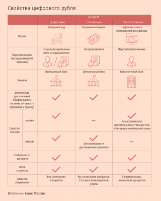 В таком случае цифровой рубль объединит преимущества наличных и безналичных денег: быстроту и дешевизну расчетов (с применением онлайн-банкинга, банковских карт и сервисов мгновенных платежей) независимо от наличия связи, да к тому же бóльшую безопасность. По задумке ЦБ, цифровой рубль должен: