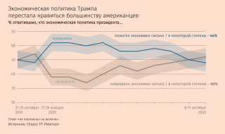 Последний перед выборами ежемесячный опрос, проведенный по заказу FT и Peter G Peterson Foundation, показал, что 46% американцев отрицательно оценивают экономическую политику Трампа, а 44% – положительно. Доля первых, значительно выросшая с начала пандемии, впервые превысила долю вторых. В марте, еще до карантина, большинство американцев с преимуществом в 11 процентных пунктов считали, что политика Трампа помогает экономике.