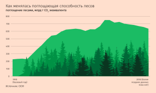 Поглощающая способность лесов России снижается – леса горят, стареют, болеют, страдают от вредителей, вырубаются, констатирует Сафонов. Пессимистичные прогнозы показывают снижение поглощения газов с нынешних 650–700 млн до 100 млн т СО2 в год к 2050 г.