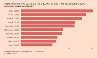 Резкий рост акций крупных технологических корпораций в 2020 г. стал подарком для компаний, решивших провести IPO. В сентябре инвесторы взвинтили цены на акции облачной компании Snowflake, сделав ставку на то, что ей будет выгоден перевод бизнесом своих операций в онлайн. Акции Snowflake выросли более чем вдвое в первый день торгов, и их приобрела даже Berkshire Hathaway Уоррена Баффетта, который обычно предпочитает недорогие покупки. Аналогичные мотивы подняли цену акций DoorDash, извлекшей выгоду из бума на доставку продуктов.