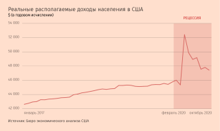 В результате реальные располагаемые доходы населения в США выросли в кризис так, как долгие годы не росли до этого. Хотя в начале 2020 г. безработица была на историческом минимуме 3,5%, а сейчас составляет 6,7%. Если в конце 2019 г. подушевой доход составлял $45 428 в годовом исчислении, то в апреле, когда пошли первые бюджетные выплаты, — $52 423 (при этом безработица в тот месяц подскочила до 14,7%), а в октябре (последние данные) — $47 424.