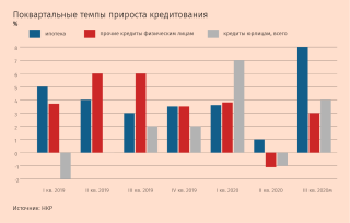 Из-за бурного роста ипотеки доля наиболее проблемных ссуд в ипотечном портфеле банков может достигнуть 2% по итогам 2021 г. против 1,6% на начало октября, ожидают в НКР. Также банки будут стремиться нарастить портфель в наиболее маржинальном сегменте необеспеченных потребкредитов, чтобы поддержать рентабельность. Кредитование юрлиц продолжит стагнировать в 2021 г. или покажет слабоположительную динамику, отмечают в «Эксперт РА»: в этом году темпы роста кредитования компаний поддержала выдача льготных кредитов, но это был разовый эффект. По прогнозам НКР, доля просроченной задолженности в потребительском кредитовании (без учета ипотеки) может вырасти с текущих 8% до 10% по итогам 2021 г., говорит управляющий директор рейтингового агентства Михаил Доронкин. В корпоративном кредитовании агентство ожидает ускорения просрочки в сегменте МСБ: доля просрочки в портфеле МСБ по итогам следующего года может достичь 14% (против порядка 12% сейчас), но она продолжит размываться новыми выдачами.