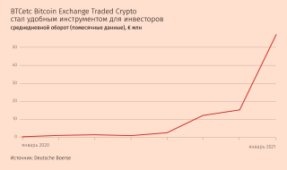 За первые 11 дней января среднедневной объем торгов биржевой нотой BTCetc Bitcoin Exchange Traded Crypto (BTCE) составил €57 млн, по данным Deutsche Boerse. Это гораздо выше декабрьского показателя в €15,5 млн, который тоже был рекордным. В росте активности инвесторов нет ничего удивительного. С минимумов марта биткойн подорожал в 10 раз, в январе его курс достиг почти $42 000, хотя затем немного снизился.
