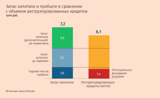 По оценкам банков, еще 20–30% из 6,1 трлн руб. реструктурированных кредитов могут стать проблемными, отметил Данилов, но сейчас просрочка по кредитам незначительная, по части уже созданы резервы, поэтому потенциальный размер дополнительного резервирования будет меньше. Верхняя планка ЦБ — 2,2%, или 1,4 трлн руб., от всего кредитного портфеля еще будет направлено на резервы по реструктурированным кредитам. Но запас прочности у банков более 7 трлн руб. до момента, когда сектор пробьет нормативы, — это полностью перекрывает весь объем неструктурированных кредитов.