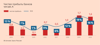 У банков есть существенный задел прочности, и пока можно смотреть на 2021 г. со сдержанным оптимизмом, считает Данилов. Пока ЦБ не дает прогнозов по прибыли банков на этот год, но «картина будет схожая», полагает Данилов, хотя расходы на резервы могут вырасти. Основные вопросы: как поведут себя реструктурированные кредиты и с какой скоростью банки будут создавать по ним резервы. «Большой просадки я бы не ждал, прибыль будет более 1 трлн руб.», — отметил Данилов.