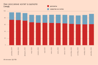 Всего за прошлый год рублевые средства населения в банках выросли почти на 1,6 трлн руб. Валютные счета, наоборот, сократились на $4,4 млрд в долларовом эквиваленте. Однако за счет значительного ослабления рубля в прошлом году (на 19% к доллару и 31% к евро) в рублевом эквиваленте валютные счета даже выросли — на 825 млрд руб.