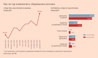 Совокупный портфель средств физлиц в банках во всех валютах в рублевом эквиваленте к началу 2021 г. в итоге достиг 32,8 трлн руб. По сравнению с предыдущим годом рост сбережений граждан в банках замедлился почти вдвое: с 9,7 до 4,2% (с поправкой на валютную переоценку). Правда, ЦБ не учитывает счета эскроу, средства на которых за год выросли более чем на 1 трлн рублей.