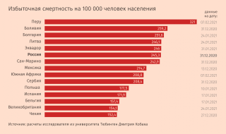 Если сравнивать избыточную смертность на конец года с данными оперативного штаба, в Петербурге и Бурятии, расхождение будет вдвое, в Москве — в 2,5 раза. Но в подавляющем большинстве регионов оно значительно выше, говорит Кобак: «Есть примеры огромного недоучета в Татарстане (превышение избыточной смертности над данными оперативного штаба — в 60 раз), в Чечне (в 30 раз), в Дагестане (в 5 раз)».
