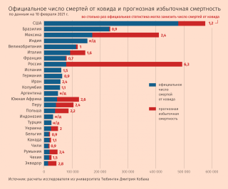 Избыточная смертность — наиболее объективный показатель жертв эпидемии ковида, считает специалист по анализу данных и машинному обучению, научный сотрудник Университета Тюбингена в Германии Дмитрий Кобак. В Бельгии, Франции и Германии избыточная смертность хорошо согласуется с данными местных оперативных штабов. Во многих других странах, среди которых и Россия, наблюдается недоучет смертей.