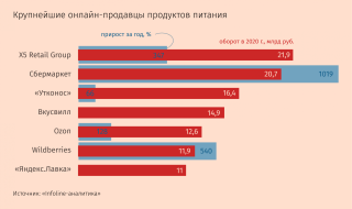 Умение вовремя понять важность цифровизации и больших данных позволило X5 вырваться вперед, считает Бурмистров. Итог — за 2020 г. X5, по данным «Infoline-аналитики», стала лидером среди онлайн-продавцов продуктами питания с оборотом 21,9 млрд руб. с НДС. Свыше 68% этой суммы приходится на долю онлайн-гипермаркета «Перекресток впрок», остальное — на сервисы экспресс-доставки из «Пятерочки», «Перекрестка» и агрегатора экспресс-доставки «Около», сообщал ритейлер. Всего на долю цифровых бизнесов X5, по собственным данным, пришелся в прошлом году 1% продаж, цель до 2023 г. — 5% оборота.