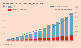 Крупнейшая негосударственная инициатива и основной драйвер для финансовых рынков — Principles of Responsible Investment (PRI). Это поддерживаемое ООН объединение инвесторов, которые обязуются вкладывать средства в соответствии с принципами ESG. На начало 2020 г. число подписантов PRI превысило 3000, а активы под их управлением составили более $103 трлн по сравнению с $59 трлн в 2015 г. За 2021 г. число подписантов увеличилось еще на четверть.