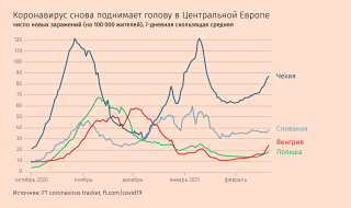 В Венгрии также наблюдается резкий рост числа новых случаев заражения: инфицированных за последнюю неделю было на 50% больше, чем за предыдущую, увеличилось и количество смертей. Откат второй волны пандемии в Центральной Европе был прерван приходом третьей, заявила главный врач Венгрии Сесилия Мюллер, то есть новая волна «начинается с более высокого уровня». «Очень опасный» британский штамм присутствует и в Венгрии, что делает «возможность бессимптомного заражения гораздо опаснее», предупредила Мюллер на брифинге для прессы.