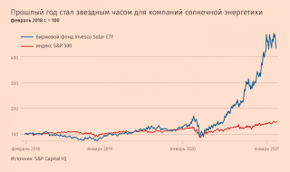 Как говорилось в недавнем отчете Morgan Stanley, у компаний из корзины зеленых акций P/E выросло за 2020 г. в среднем на 24 пункта, тогда как у обычных компаний сектора — всего на 2 пункта. Один из таких примеров — стремительное ралли акций производителя солнечной энергии SunPower, которые взлетели с $10 в начале сентября 2020 г. до более $55 в конце января (после чего частично сдали позиции, опустившись до $35).