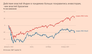 Инвесторы также положительно реагируют на антикризисную финансовую помощь, оказываемую национальными правительствами. Индия, в частности, увеличила госрасходы на инфраструктуру на 50% по сравнению со средним показателем за последние 10 лет. В Бразилии же, где такие инвестиции остаются на низком уровне уже не одно десятилетие, главным ответом на пандемию стали субсидии на потребление — шаг, выгодный для властей с политической точки зрения, но менее значимый для обеспечения развития и долгосрочного экономического роста.