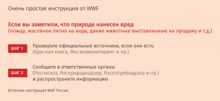 WWF России сделал короткие инструкции о том, как обычный человек может найти или, наоборот, сообщить важную экологическую информацию. Например, уточнить законность обнаруженной в лесу рубки можно попробовать по «горячей линии» Рослесхоза. Туда же нужно звонить, если увидели в лесу пожар. При загрязнении воды маслянистыми пятнами — обращаться в Росприроднадзор. Почувствовав неприятный запах — проверить по открытым картам состояние воздуха (в Москве — Мосэкомониторинг), а затем сообщить в Росприроднадзор. Можно также обращаться в Роспотребнадзор, местные природоохранные ведомства и прокуратуру (отдельная инструкция «Как не дышать грязным воздухом» есть и у Greenpeace).
