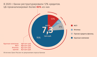Анализ качества 80% кредитов регулятором показал, что 64% реструктурированных кредитов крупным компаниям (всего банки реструктурировали им кредитов на 5,5 трлн руб.) пришлось на три отрасли — нефтегазовую промышленность (25%), металлургию (15%) и недвижимость со строительством (25%). При этом доля крупных компаний, чье финансовое положение уязвимо, составила 40%. Больше всего уязвимых компаний оказалось в секторе недвижимости — там таких заемщиков больше 60%, в нефтегазовой отрасли их 55%, в металлургии — 45%.