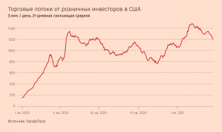 Нетто-покупки розничных инвесторов упали с февральского пика почти на 20% до $1,2 млрд в день, по расчетам Vanda Research (для сглаживания суточных колебаний компания использует 21-дневную скользящую среднюю). И это несмотря на ожидания аналитиков, что по крайней мере часть денег, полученных от правительства США в рамках пакета стимулирующих мер на $1,9 трлн, будет немедленно направлена на фондовый рынок.