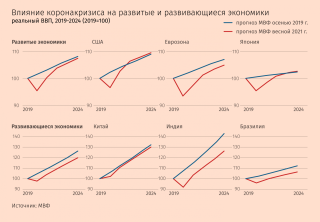 В результате, по прогнозу фонда, в 2024 г. ВВП развитых стран будет лишь на 1% меньше, чем фонд ожидал в 2019 г. А экономика США будет расти быстрее, чем до пандемии, и в 2024 г. даже покажет лучший результат, чем фонд прогнозировал до коронакризиса.