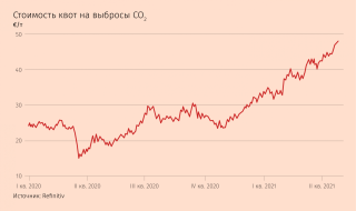 Цены в европейской Системе торговли квотами на выбросы углекислого газа (ETS) выросли более чем вдвое по сравнению с уровнем до начала пандемии и почти достигли 50 евро за тонну. ETS — краеугольный камень зеленой политики Евросоюза, который недавно поставил новую амбициозную цель — сократить вредные выбросы на 55% к 2030 г. Однако их стоимость в ЕС в результате быстрого роста цен на квоты сейчас значительно превышает стоимость в любом другом регионе.