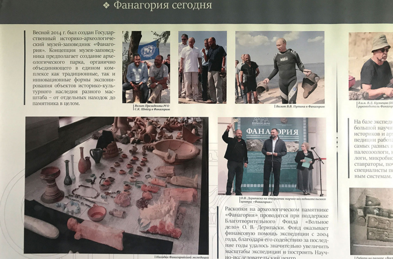 Из десятка крупных полисов, основанных эллинами на северном побережье Черного моря, больше других повезло Фанагории. Остатки древнегреческого поселения на территории нынешнего поселка Сенной в Темрюкском районе оказались по соседству с малой родиной миллиардера Олега Дерипаски. С 2004 г. благотворительный фонд бизнесмена «Вольное дело» пожертвовал на раскопки Фанагории 717 млн руб. или $16,4 млн. Фанагория превратилась в крупнейший в стране центр археологических раскопок и один из немногих в Европе, где ведутся систематические подводные исследования (1/3 площади античного города, основанного более 2500 лет назад, со временем оказались под водой).