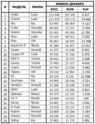 Лидером по продажам в России в прошлом году стала LADA Vesta - 113 698 проданных машин с января по декабрь. Это почти на 6500 больше, чем в 2020 году. На второе место опустилась LADA Granta. Её из-за дефицита и многочисленных простоев производства приобрели только 111 430 россиян. Третим идет корейский седан Kia Rio с результатом в 82 941 продажами. В пятерку лидеров вошли модели Creta и Solaris от Hyundai. Их реализовали в количестве 68 071 и 61 061 единиц соответственно.