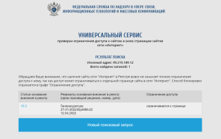 Универсальный сервис проверки ограничений от Роскомнадзора подтверждает, что этот IP-адрес заблокирован на основании решения Генпрокуратуры 27-31-2022/Ид4988-22 от 12.04.2022