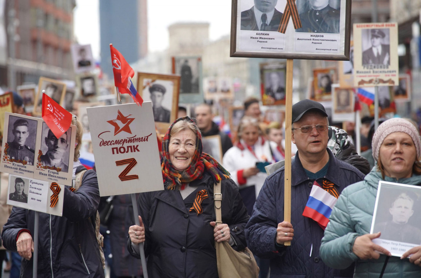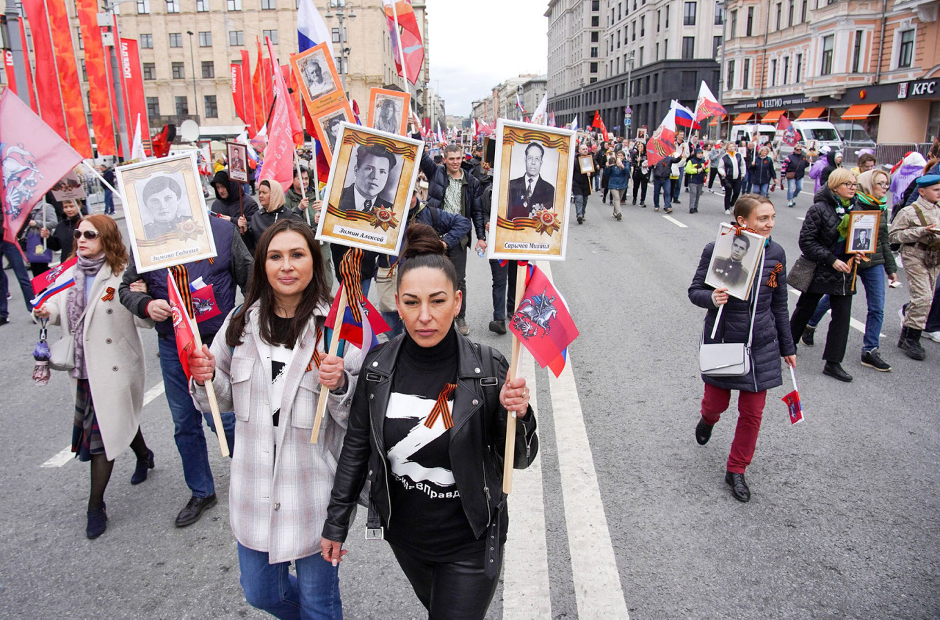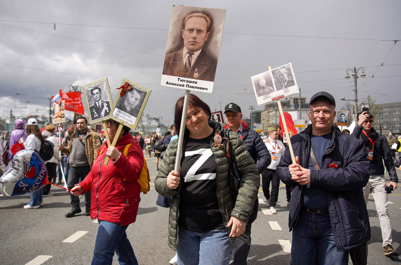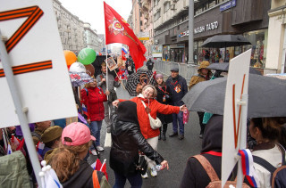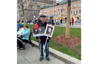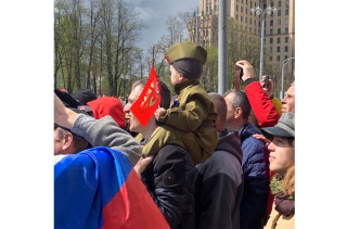 «9 мая — это про подвиги дедов. Мы радуемся, помним, чтим. Сегодняшние события в Харькове, Одессе, Киеве, Мариуполе — это про подвиги современной России. Нас вынудили. Никакой двойственности в этом нет», — объясняет мужчина лет тридцати, представившийся Никитой. В акции «Бессмертный полк» он участвует впервые. Специально приехал в столицу из Новосибирска. В руках он несет фотографии двух дедов, участвовавших в Великой Отечественной войне.