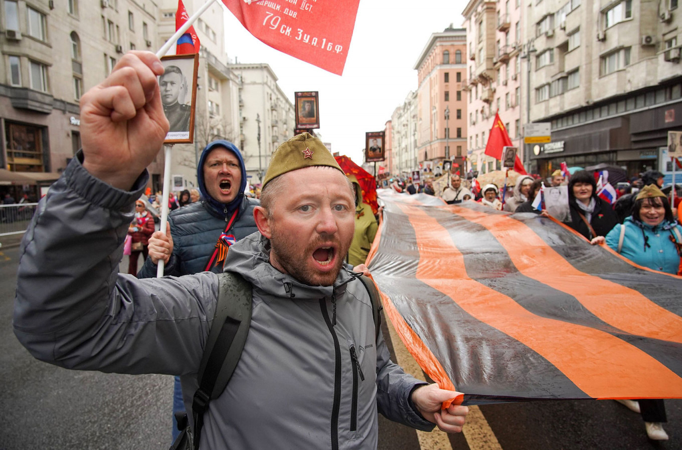 Участники «Бессмертного полка» прошли от Тверской-Ямской пару километров, когда толпа мужчин разворачивает большой флаг с фотографией актера Сергея Бодрова. Рядом появляется черно-зеленый флаг, а на нем белая буква Z. Люди выкрикивали «Ура!», «Брат», «Россия».