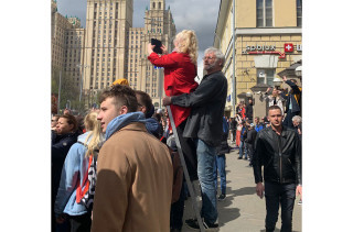 Нарядные москвичи с гвоздиками, георгиевскими ленточками и Z-значками на груди в 10:30 утра толпятся у выхода из метро «Баррикадная»: ждут, когда военная техника после парада Победы на Красной площади будет возвращаться по этим центральным улицам в места постоянной дислокации. У многих заготовлены стремянки и стулья.