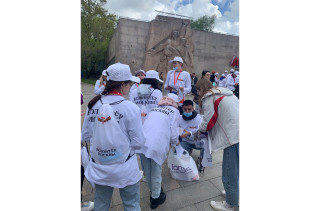 — Возьмите георгиевскую ленточку и советский флаг, — предлагает мне юноша в белой униформе. — Хотите воду или флаг России еще? Мы волонтеры. Во всем помогаем.
