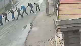 Издание показало короткое видео, снятое камерой внешнего наблюдения 4 марта. В ролике двое вооруженных людей ведут цепочкой девятерых безоружных мужчин за здание, где располагалась база россиян. Почти все эти пленники позже были найдены мертвыми: 5 марта беспилотник заснял, как группа военных стоит возле нескольких трупов. На одном из них была такая же синяя кофта, как на человеке из цепочки. 3 апреля, после ухода российских войск из Бучи, тело этого мужчины в синей кофте попало в объективы фотокамер журналистов.