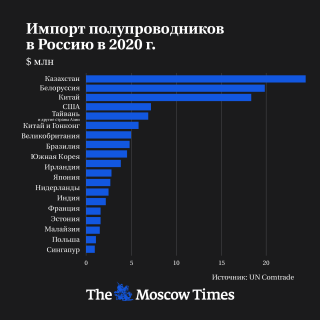 Большинство крупнейших мировых производителей чипов, включая Intel, Samsung, TSMC и Qualcomm, полностью прекратили поставки в Россию после того, как США, Великобритания и Европа ввели экспортный контроль за продукцией, в которой используются чипы, произведенные или разработанные в США либо Европе.