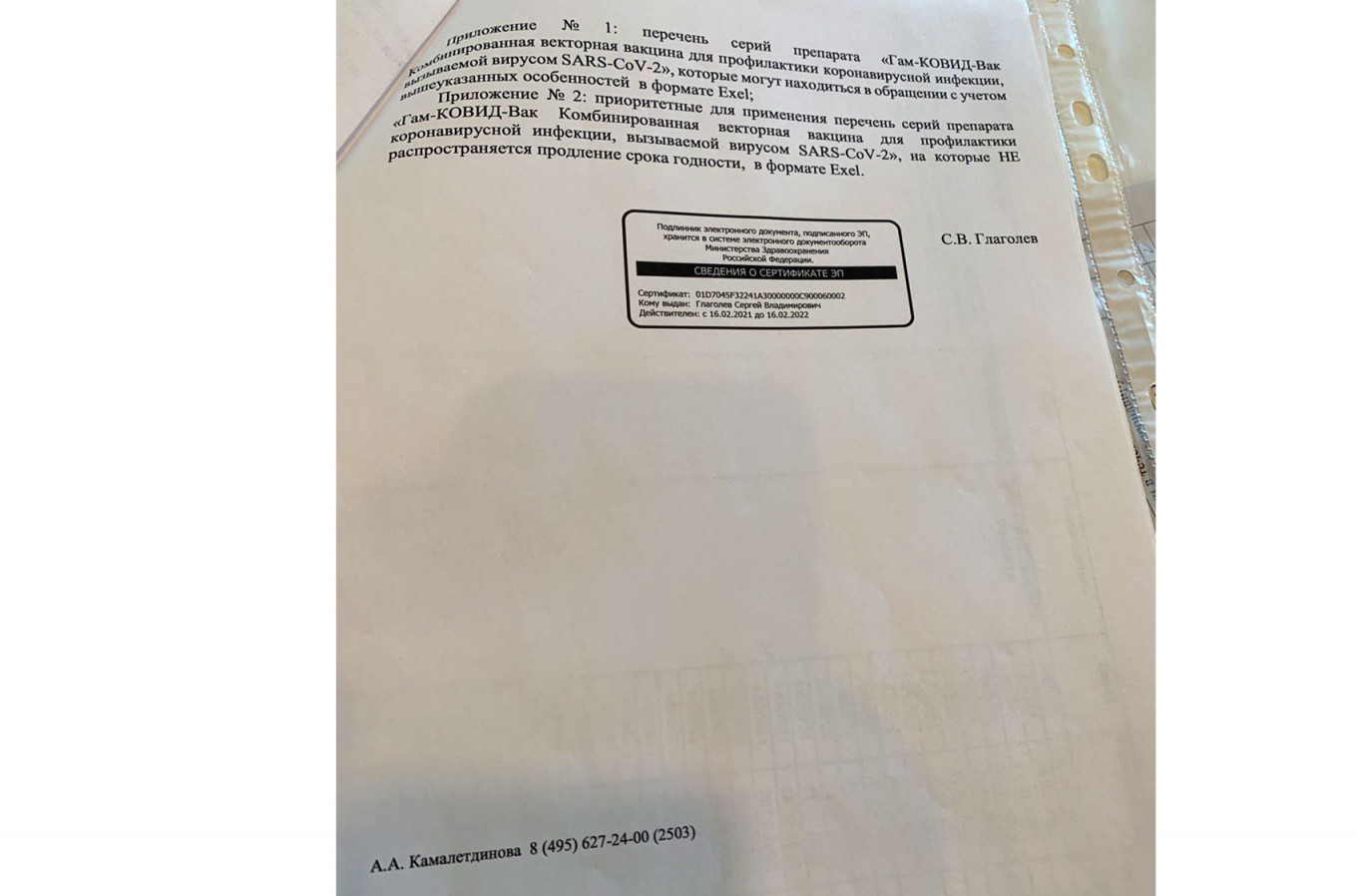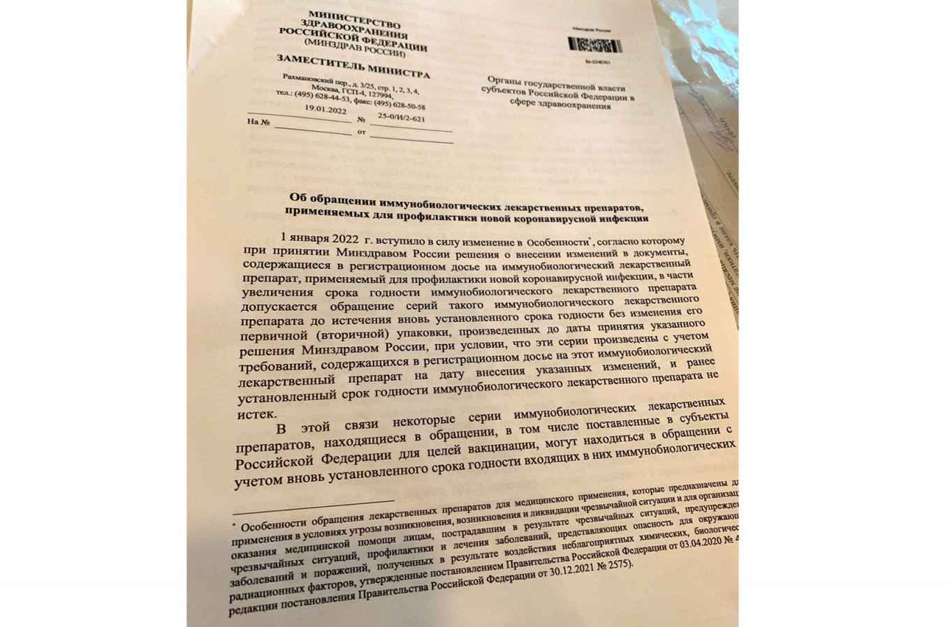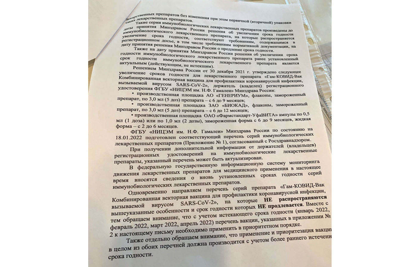 Для убедительности медсестра показала январский приказ Минздрава, из которого следует, что срок действия вакцин продлен. Просроченная вакцина в замороженном состоянии, согласно документу, продлевается с шести до девяти месяцев, в жидком состоянии — с двух до шести месяцев. В документе говорится, что вакцину с истекшим сроком в январе, феврале, марте и апреле 2022 года следует продолжать применять в приоритетном порядке.