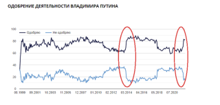 С ущербностью, то есть неполнотой официально одобряемой социальной информации, когда исследователи просто не могут задавать многие принципиальные вопросы своим респондентам, в первую очередь можно бороться через показ значимых трендов и корреляций. Так, вне зависимости от абсолютных значений одобрения деятельности Владимира Путина из графика Левады мы видим, что путинская система предпринимает радикальные, немыслимые ранее шаги именно тогда, когда ей необходимо упрочить свое положение, нейтрализовав главную угрозу — угрозу чрезмерного падения своей популярности как основы права на правление.