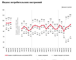 Оценки текущего состояния экономики предсказуемо рухнули: каждый четвертый считает, что инфляция в стране вдвое больше официальной и превышает 30%; 71% жалуются, что цены выросли «сильнее, чем раньше». Общий индекс настроений потребителей упал до 6-летнего минимума (63 пункта в апреле) и лишь немного восстановился на четвертый месяц войны (70 пунктов в июне).