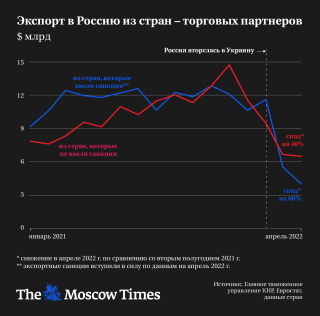 Санкции порождают курьезы в международной торговле. Белоруссия, известная своими креветками (она стала поставлять их в Россию из других стран после санкций 2014 г.), в апреле по объему экспорта в Россию обогнала Германию, чья экономика в 60 раз больше белорусской и которая в недавнем прошлом была крупнейшим торговым партнером России, писал Bloomberg. «Рынок практически рухнул, — говорил агентству Андрей Побежимов, руководитель службы международной логистики СДЭК. — Сегодня очень сложно доставить груз из Европы, иногда просто невозможно».