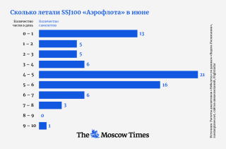 Из 76 SSJ, находящихся в парке группы «Аэрофлот», 12 не летают, подсчитал телеграм-канал «Неболёт»: 9 совсем не поднимались в воздух в июне, еще 3 провели в полете меньше 30 минут в день.