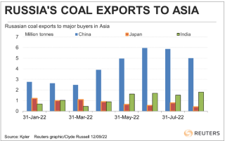 Спустя месяц с начала действия 10 августа угольного эмбарго ЕС можно подвести первые итоги. Китай и Индия, как и в случае с нефтью, помогли России частично компенсировать падение поставок угля в Европу. Но неожиданно выяснилось, что запрет на страхование судов с российским углем касается поставок не только в Европу, но и по всему миру. Это ударило по его экспорту в Азию, где крупными покупателями также были Япония и Южная Корея, поддержавшие санкции США и Европы против России.