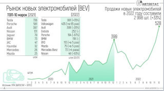В России за 2022 г. было продано 2998 новых легковых «чистых» электромобилей (BEV) – на треть больше, чем в 2021 г., утверждает «Автостат» со ссылкой на регистрационные данные. По информации комитета автопроизводителей Ассоциации европейского бизнеса (АЕБ), официально в Россию было импортировано только 400 из них, остальные ввезены физлицами или по параллельному импорту.