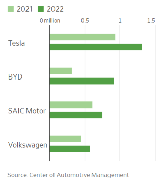 Volkswagen по итогам года оказался на 4-м месте по мировым продажам, перед ним – китайские BYD и SAIC Motor. Лидером остается Tesla, у которой продажи преодолели рубеж в 1 млн и составили 1,314 млн машин.