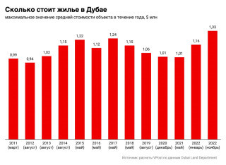 Цены на квартиры, как выяснил VPost из данных Dubai Land Department, уже по итогам ноября 2022 года тоже установили исторический рекорд, перевалив через продержавшийся пять лет пик 2017 года. По итогам ноября средняя цена объекта жилой недвижимости превысила 1,33 млн дирхамов или примерно $362 000, что на 18% выше, чем годом ранее и на 7% больше предыдущего максимума, зафиксированного в мае 2017 г. Рекорд установлен благодаря резкому подорожанию квартир — виллы в Дубае в среднем все еще стоят дешевле, чем пять лет назад.